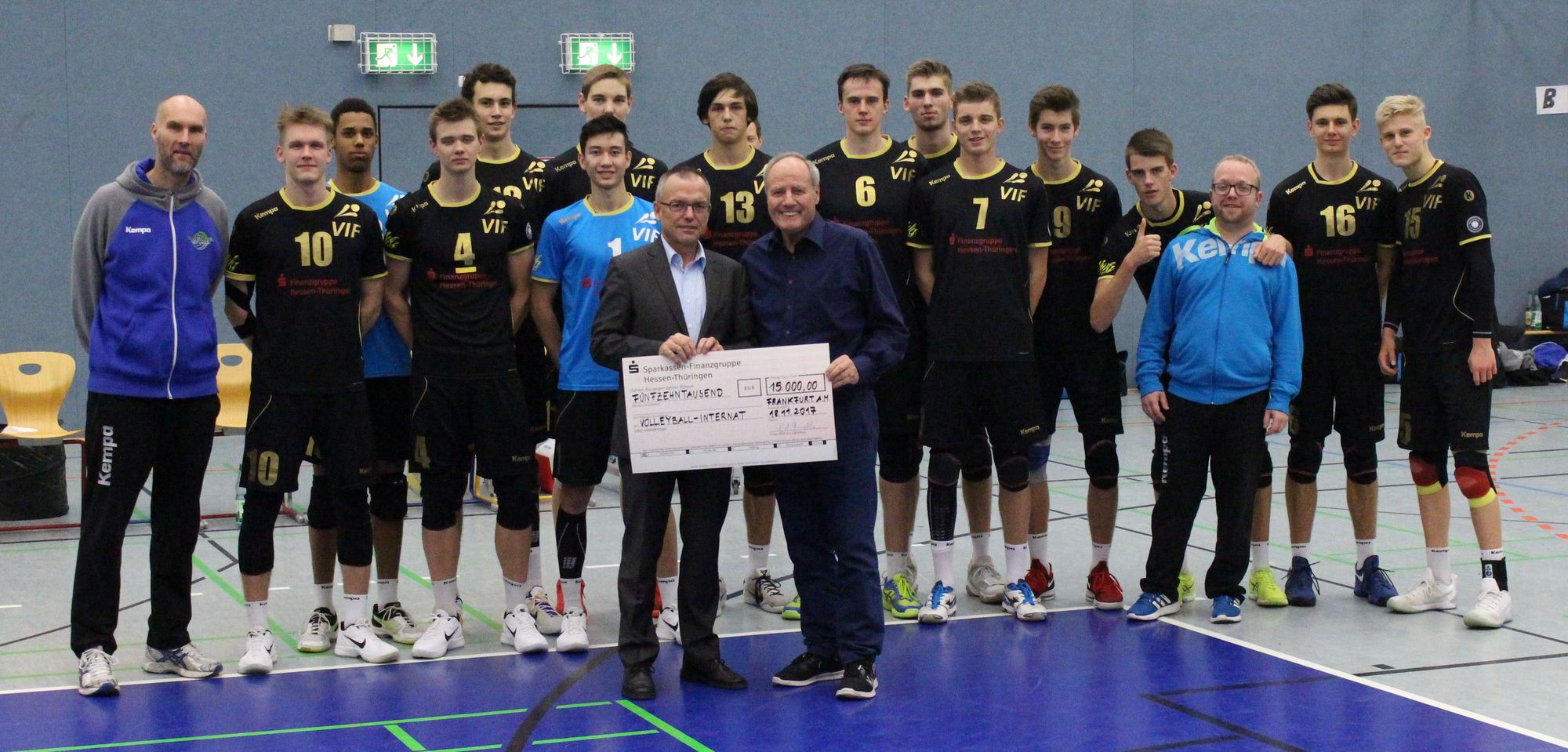 Björn Christian Stein, Vorsitzender vom Förderverein des Volleyball-Internats Frankfurt, bekam von Matthias Haupt, dem Abteilungsleiter des Sparkassen- und Giroverbandes Hessen-Thüringen, vor dem Spiel gegen Grafing einen Spendenscheck über 15.000 Euro überreicht. Damit ist der Sparkassenverband ein treuer und wertvoller Wegbegleiter, denn bereits seit Gründung des Internats im Sommer 1983 unterstützt der Verband die Volleyball-Talente in Frankfurt.
